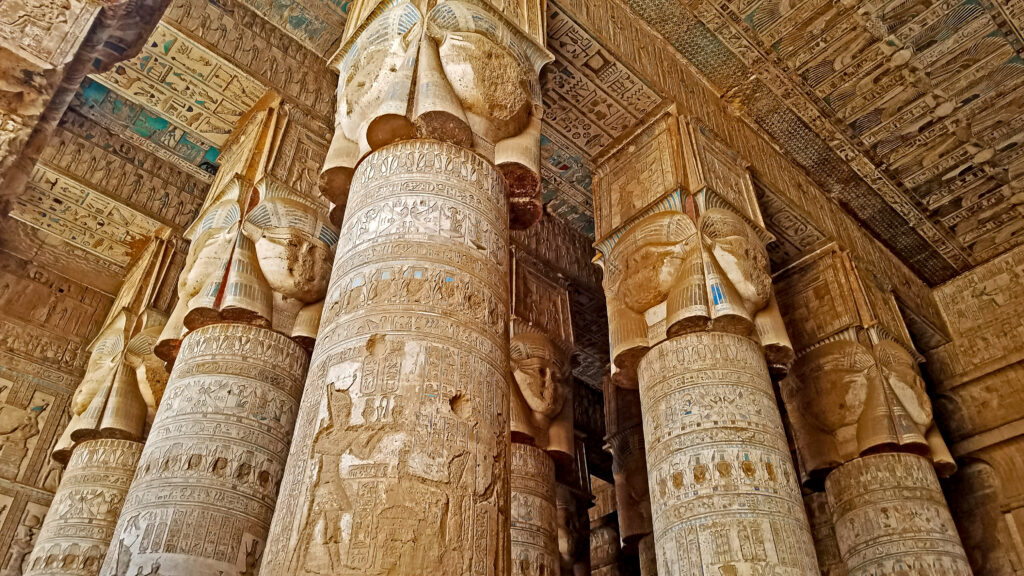 Der Hathor-Tempel von Dendera ist einer der am besten erhaltenen Tempel des Landes. Seine monumentalen Säulen, kunstvollen Hieroglyphen und die berühmten, farbenprächtigen Decken erzählen Geschichten aus einer Zeit, in der Götter und Menschen eng miteinander verbunden waren.